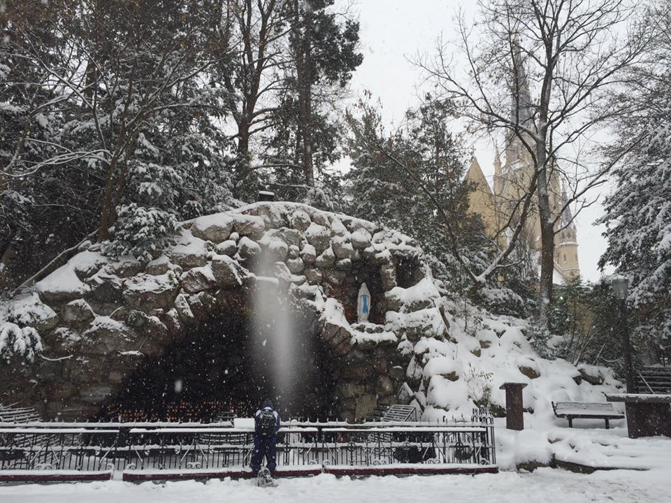 Fue un domingo, y debido a mi pobre manejo en la administración de la regadera de mi familia (1 regadera para seis personas), experimentamos un “embotellamiento con la regadera” y no pudimos estar todos a tiempo de llegar a nuestra acostumbrada misa de las 11:00 de la mañana en la Catedral.  Por eso fuimos a la misa de las 11:45 en la Basílica del Sagrado Corazón de Jesús en la Universidad de Notre Dame.  Después, estaba nevando con una nieve mojada y pesada.  En camino al estacionamiento, me detuve paré en la Gruta instintivamente y me conmovió la presencia de un estudiante solitario rezando de rodillas con devoción.  Me decidí a tomar una foto porque este joven – que se veía como un deportista – no se movió durante todo el tiempo.  La nieve se estaba acumulando encima de él.  Tan pronto tomé la foto, mi “iPhone” se apagó de repente, a pesar del hecho que aún tenía una carga del 42 por ciento.  Era la 1:50 de la tarde.