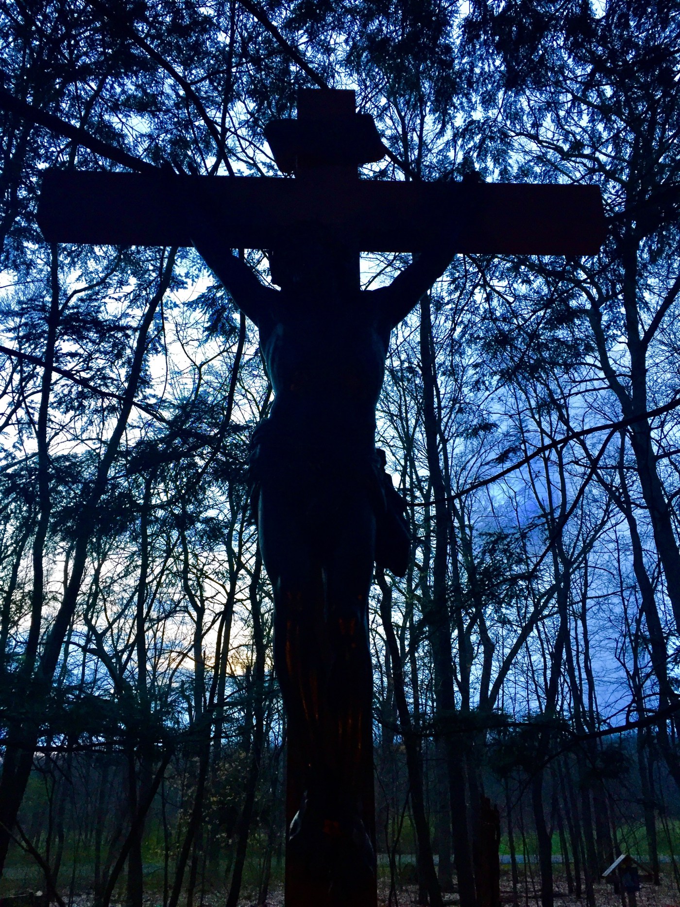 Good Friday services at Saint Matthew Cathedral felt like a funeral for me today: A feeling of Loss. Regret. Guilt. And Tears. Lots of tears. Why? Because the facts of the matter warrant tears. What we did to Jesus is beyond comprehension. I’m ashamed and embarrassed for the role I played in it all. When I got home I took a long walk. I walked to this life sized crucifix in the woods and stood directly beneath it, then got a strong urge to express the sadness and regret of Good Friday. All I could think of today was this: