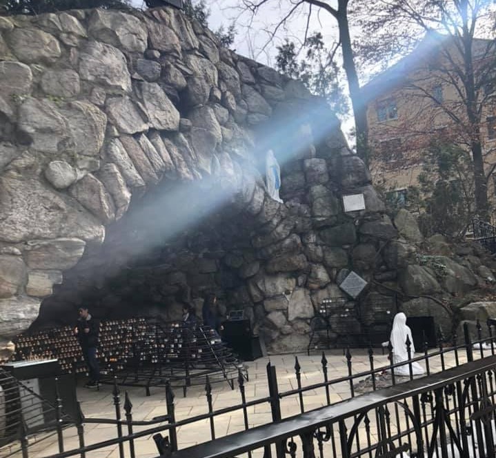 Last week, a high school and college classmate of mine – among the smartest and most successful kids in those classes – visited this same Grotto and took a few photos. One of them contained this remarkable stream of light. Upon seeing it, another good spiritual friend of mine remarked that it looked like a representation of prayers shooting up to heaven from a candle lit to do just that. I agree.